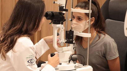 Exame com lâmpada de fenda: conhecido como biomicroscopia. Os olhos são examinados em um microscópio que permite ver as suas estruturas em grande aumento e em detalhes.
